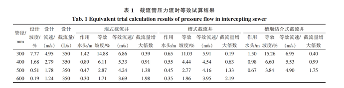 楊根權(quán)≌通過研究得出有作用水頭的截流管可等效視為一段坡度增大的無壓滿流管,兩者流速相差不大。筆者采用設(shè)計截流量 0=350 L/s,截流管長L=20 m,截流管管徑 D=300~600 mm,當(dāng)截流管內(nèi)水流由重力流變?yōu)閴毫α鲿r,對3種傳統(tǒng)截流井實際截流量進行試算,結(jié)果見表1。