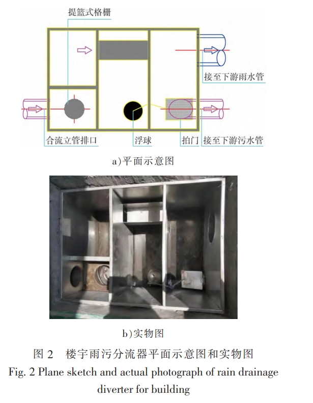 樓宇雨污分流器(見圖2)是針對混接排水立管分流改造的一體化設(shè)備,設(shè)置在排水立管末端,一般埋地安裝。其本質(zhì)是在槽堰結(jié)合式截流井的基礎(chǔ)上,增設(shè)微型提籃式格柵來除渣以免堵塞,增設(shè)浮球控制的拍門削減雨天較清潔的排水進人下游污水管。設(shè)備使用前需調(diào)查混接排水立管接入情況,嚴(yán)禁馬桶或蹲坑污水接人,以免較大雜物堵塞進水口使其功能喪失。另外,由于上游管道基本沒有調(diào)蓄容量實際使用中瞬時排水量較大時,容易造成污水溢流進入下游雨水管。