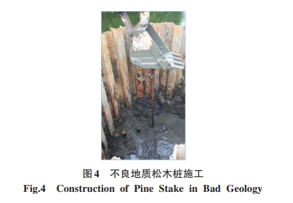 (1) 圍堰和地基處理:截流井采用拉森鋼板樁圍堰止水,可以充當臨時擋土、擋水的圍護結構;采用PC-200型長臂挖掘機對截流井周邊河道進行清淤:對于不良地質(如淤泥層)通過打松木樁、拋石擠淤、鋪設砂石墊層等措施進行地基加固處理”,如圖4所示。