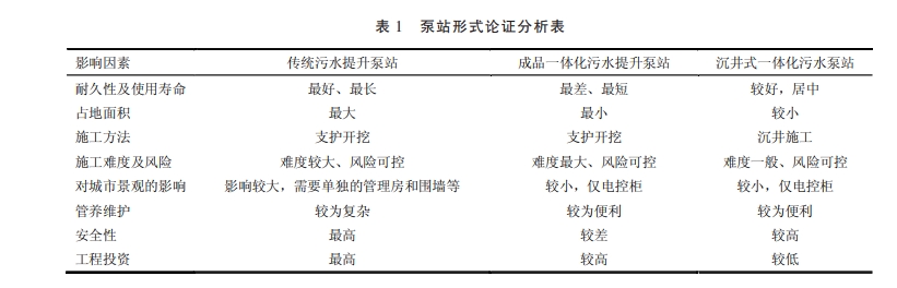 污水泵站主要形式為傳統(tǒng)污水提升泵站、成品一體化污水提升泵站、沉井式一體化污水提升泵站等,具體對(duì)比情況見(jiàn)表1。3種方案中傳統(tǒng)污水提升泵站占地面積最大,投資最高,施工周期長(zhǎng),且不利于城市景觀,暫不予考慮。根據(jù)勘察資料及現(xiàn)場(chǎng)情況,擬設(shè)泵站位置場(chǎng)地相對(duì)狹小、靠近河涌,采用開(kāi)挖施工方式會(huì)帶來(lái)諸多不可預(yù)見(jiàn)的情況。考點(diǎn)到泵站規(guī)模、場(chǎng)地條件等因素,初步采用沉井式一體化污水泵站。對(duì)方案的應(yīng)用考慮如下。