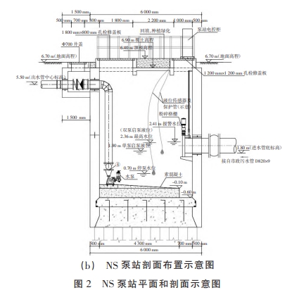 NS 泵站采用矩形布置,占地面積約 49 m。泵站整體采用鋼筋混凝土箱體結(jié)構(gòu),LxBxH=6.0 mx7.0 mx7.5 m,泵站采用全地埋形式,設(shè)置3類檢修孔,分別為水泵檢修孔 LxB=1.8 mx0.8m、清淤孔 Ф700、格柵檢修口 LxB=1.2 mx1.2m,平面和剖面布置示意圖如圖 2所示。為避免同一區(qū)域開(kāi)挖大基坑,泵前檢修閘門(mén)設(shè)置閘站上游 20m污水檢查井內(nèi),采用圓形閘門(mén),無(wú)漏出地埋的操作桿。