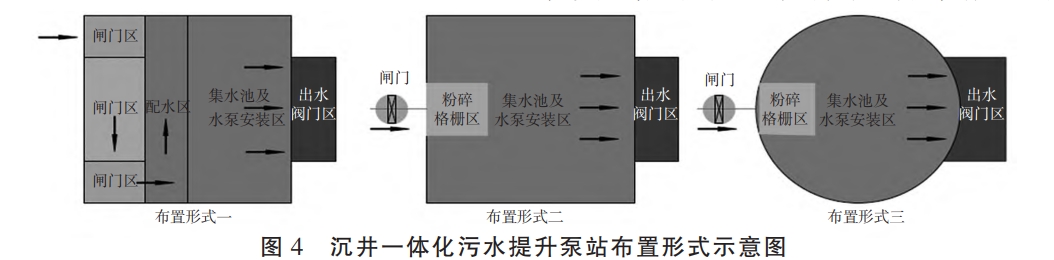 3.4.1 泵站的集約化布置經(jīng)對(duì)比研究,沉井式一體化污水提升泵站主要有以下3種布置形式(圖4),其中布置形式一采用回轉(zhuǎn)式機(jī)械格柵,將格柵及格柵檢修、泵站檢修閥門(mén)設(shè)置在沉井內(nèi)部,通過(guò)內(nèi)部隔墻分為不同的功能區(qū),不同功能區(qū)的高程差異通過(guò)素混凝土二次填充實(shí)現(xiàn);布置形式二和布置形式三均采用粉碎格柵,將格柵安裝在沉井內(nèi)壁,將泵站檢修閥門(mén)井設(shè)置在沉井外的第一個(gè)污水檢查井內(nèi),相比布置形式一,布置形式二和布置形式三用地更加集約。3種布置形式的共性是閥門(mén)井二次施工澆筑。本研究案例中的CZ泵站屬于布置形式一、NS泵站屬于布置形式二,從實(shí)際設(shè)計(jì)來(lái)看,雖然 NS 泵站規(guī)模遠(yuǎn)大于 CZ 泵站,但得益于粉碎格柵的使用,NS 泵站占地面積比 CZ 泵站更小,。