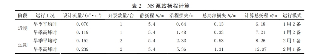 水泵揚(yáng)程確定是水泵選型的重要考慮因素,水泵的揚(yáng)程主要由靜揚(yáng)程、沿程損失和局部損失構(gòu)成,此外,為保障水泵運(yùn)營(yíng)安全,一般預(yù)留一定的富余水頭。在計(jì)算水泵揚(yáng)程時(shí),應(yīng)分別按近期、遠(yuǎn)期的旱季平均和旱季高峰等工況進(jìn)行計(jì)算,按最大值選取水泵。當(dāng)計(jì)算的水泵揚(yáng)程過(guò)高時(shí),應(yīng)通過(guò)調(diào)整出水管管徑的方式降低流速,從而降低揚(yáng)程。在計(jì)算沿程損失時(shí),應(yīng)采用海曾威廉公式計(jì)算。以 NS泵站為例,不同工況下,揚(yáng)程計(jì)算結(jié)果詳見(jiàn)表2,計(jì)算泵站揚(yáng)程在6.18-12.07m,考慮最不利工況揚(yáng)程為 12.07m,預(yù)留2m左右富余水頭,最終選取水泵揚(yáng)程 日=14m。在選用水泵時(shí),優(yōu)先選擇帶切削功能的變頻泵。當(dāng)泵站服務(wù)分區(qū)內(nèi)存在合流區(qū)時(shí),還應(yīng)考慮雨季運(yùn)行工況下?lián)P程的復(fù)核。