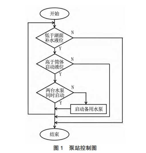 系統調試期間,利用人機操作程序的觸摸屏,準確獲取補水液位參數、簡體運行的初始液位等參數。系統運行期間,PLC能夠持續監測簡體、補水湖面各個位置的液位參數,由傳感器進行信息反饋,與初期設定參數進行對比。當水位參數不大于湖面、水位高于簡體初始液位時,同時運行兩組水泵。如果一組水泵存在質量問題,需暫停水泵,運行備用水泵。當補水液位高于初期設計參數,此時,水泵暫停運行時,需重新進行信息監測。(3)遠程控制。人機操作單元是泵站遠程監控的關鍵,能夠監測泵站的運行狀況、反饋泵站運行狀態,顯示泵站操作人員,動態呈現水泵程序的重要參數變動過程,便于巡檢人員實時獲取水泵運行情況。模塊開發后,表現出功能完整、操作便捷、可視性優勢、運維便捷等優勢。利用CPU程序,使用驅動程序補充系統所需的通訊協議,組建成聯動通訊程序。結合系統真實運行情況,有效掌握控制程序的設備運行狀況,準確設計設備各項參數,創建數據變量,給出人機操作程序,確保動態監控的全面性。控制程序中添加了各組泵站的控制按鈕,比如,啟停鍵、功能切換鍵等。遠程操作程序,可使用控制箱自主控制各類系統信號。一體式泵站內置的控制程序,設有通信接口,能夠利用交換設備進行信息傳輸,將信息傳送空曠無人、網絡覆蓋不全的位置。