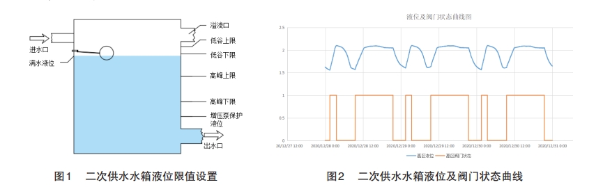 精準化控制的原理就是,將水箱進水閥門改造為可遠程控制閥門,在用水高峰期關閉進水閥門,使用水箱中儲存的水給高層用戶供水,避免用水高峰期水箱進水閥門打開給管網壓力帶來的損失,從而改善直供用戶用水質量,在用水低谷期打開供水閥門給二次供水水箱補水,通過這種方式來合理利用水廠產能,實現用水平衡、穩定管網壓力、節能降耗。