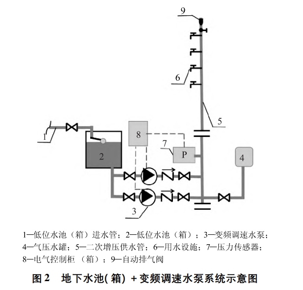 (3)保障消防系統(tǒng)。對于生活消防合用的供水系統(tǒng),為避免影響消防系統(tǒng)的正常運(yùn)行,應(yīng)盡量避免改造中牽動消防系統(tǒng)。水池生活消防合用時(shí),若泵房空間充足,優(yōu)先考慮單獨(dú)設(shè)置生活水箱,反之優(yōu)先考慮疊壓供水方式;水泵生活消防合用時(shí),優(yōu)先考慮重新設(shè)置生活水泵,將原水泵留作消防用。2.2 地下水池( 箱)+ 變頻調(diào)速水泵供水由水泵從地下水池(箱)取水,通過變頻器改變供電頻率控制水泵電機(jī)轉(zhuǎn)速,使水泵轉(zhuǎn)速和流量可調(diào)節(jié),由水泵、控制柜(含變頻器)、壓力檢測儀表、管路、閥門等組成,如圖2所示