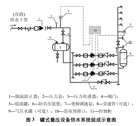 管道直聯(lián)疊壓供水技術(shù)繼水箱、工頻水泵、變頻調(diào)速水泵后發(fā)展的直接串接到市政給水管網(wǎng)的引入管或有壓管道上加壓的新型給水設(shè)備,可充分利用市政供水管網(wǎng)的壓力,減少水泵揚(yáng)程,節(jié)省電耗;省去地下水池(箱)、吸水井等構(gòu)筑物,節(jié)省投資,簡化系統(tǒng)“;可防止水在地下水池(箱)等構(gòu)筑物中的二次污染和可能的溢流水損失,方便管理維護(hù),便于水泵自動控制。其中罐式疊壓供水采用穩(wěn)流補(bǔ)償器(壓力罐)做調(diào)蓄設(shè)施的疊壓供水設(shè)備,主要由穩(wěn)流罐、變頻調(diào)速泵組、氣壓水罐、變頻控制柜、管道、閥門及儀表等組成,基本組成如圖3 所示。