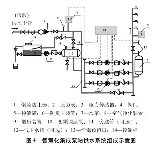 智慧化集成泵站整體形式與箱式疊壓較為相似,市政來水進(jìn)入一體式水箱,變頻泵抽取水箱內(nèi)生活用水并加壓向用戶供給,控制柜中設(shè)有更新程序,定時(shí)循環(huán)低位水箱中的水,保障飲水安全。系統(tǒng)主要由低位水箱、主泵機(jī)組、變頻控制柜、增壓裝置、引水裝置、穩(wěn)流罐、流量控制器及壓力傳感器等組成。智慧化集成泵站供水系統(tǒng)的基本組成如圖4所示。