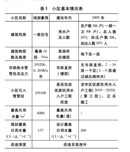 3.1 小區(qū)泵房情況評估本次給水改造各個(gè)小區(qū)分散各自獨(dú)立,各小區(qū)設(shè)計(jì)范圍較小,采用居民生活用水定額預(yù)測方法進(jìn)行計(jì)算網(wǎng),本設(shè)計(jì)案例小區(qū)為龍崗區(qū)樟富南路鴻潤豪苑,小區(qū)基本情況見表1。