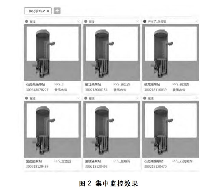 目前,廣東省、福建省等多個省份已經建成了不同類型的智能水利系統下的智能泵站平臺。此類平臺多運用于城市的自來水廠、市政的給排水管道工程中,以廣東省的某自來水廠為例,其對一分廠內的10多臺系站搭建了智能管理系統,實現了每個泵站的運行狀態監測、流量實時記錄,監測數據的實時上傳與分析,并達成了所有智能泵站的集中監控效果,具體如圖2所示,這極大地節省了人力、物力,提升了泵站的運行效率,進而提升了整個區域水利系統的出力程度。