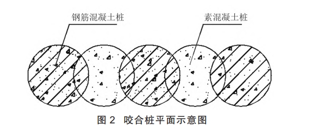 咬合樁具有防滲能力強、造價低、無需泥漿護壁、施工速度快、成樁質量高等優(yōu)點,且適用于多種地質條件。鋼筋混凝土樁與素混凝土樁切割咬合樁與樁之間排列構成相互之間互相咬合的樁墻,此種結構即為咬合樁。為便于切割,樁的排列方式一般為一根素混凝土樁和一根鋼筋混凝土樁。素混凝土樁采用超緩凝混凝土(初凝時間為60h),要求必須在素混凝土樁初凝之前完成對素混凝土樁的全部切削。鋼筋混凝土樁施工時采用全套管鉆機切割相鄰素混凝土樁相交部分的混凝土,實現(xiàn)咬合。咬合樁施工采用全套管+旋挖鉆機,施工流程為平整場地→測設樁位→施工咬合樁導墻→套管鉆機就位對中一吊安第一節(jié)套管→控測垂直度→壓人第一節(jié)套管→校核垂直度→抓斗取土,套管鉆進→孔深測量→清除虛土,檢查孔底→鋼筋混凝土樁吊放鋼筋籠→放人混凝土灌注導管→灌注混凝土逐次拔管→測定樁頂混凝土面→套管鉆機移位。咬合樁構造如圖2所示。