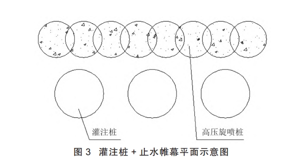 灌注樁支護體系適用于各種地質條件下的深基坑工程,具有剛度大、變形小、技術成熟、施工速度快等優(yōu)點。當需要隔地下水時,需要另行設置隔水帷幕。考慮到場地內的孔隙潛水,在灌注樁外側設高壓旋噴樁止水帷幕。灌注樁+止水帷幕構造如圖3 所示。