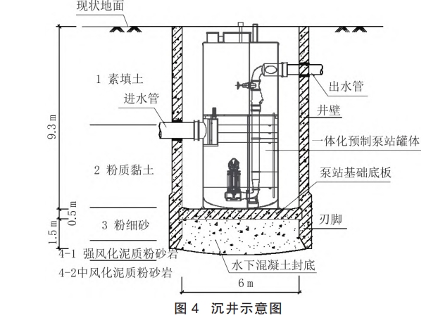 沉井是一種在地面制作后,在井內挖土并依靠自身重量克服井壁與土的摩擦力下沉至設計標高的結構,常用于工業(yè)建筑中的構筑物、橋梁基礎、臨時基坑支護等領域4。在市政工程中,鋼筋混凝土主要用于頂管工程中的工作井、接收井等。沉井下沉深度較大,整體性強、穩(wěn)定性好,可以承受較大的豎向和水平荷載,施工技術簡單,自身具有擋土和擋水的功能,適用范圍廣,且造價不高。但沉井需分節(jié)制作,分節(jié)下沉,每節(jié)高度一般不超過6m。沉井的施工順序一般為地基處理一制作第一節(jié)沉井→抽墊木、挖土下沉→沉井接高下沉→封底。沉井混凝土強度達到設計強度的 75%以上時才能下沉,單節(jié)沉井施工周期約 20~25 d。本工程地下水豐富,沉井下沉深度范圍內透水層強的粉砂層,可采用不排水法下沉施工,即沉井帶水下沉至設計高程后,采用一定厚度的水下混凝土進行封底。待水下封底混凝土強度等級達到設計要求后再將井內水抽除。水下封底前須有潛水員潛入水下檢查井底是否開挖到位,按設計要求整平基底,并將刃腳混凝土面上的泥土沖洗干凈,以確保水下混凝土有足夠的斷面抵抗地下水的上浮力。沉井如圖 4所示