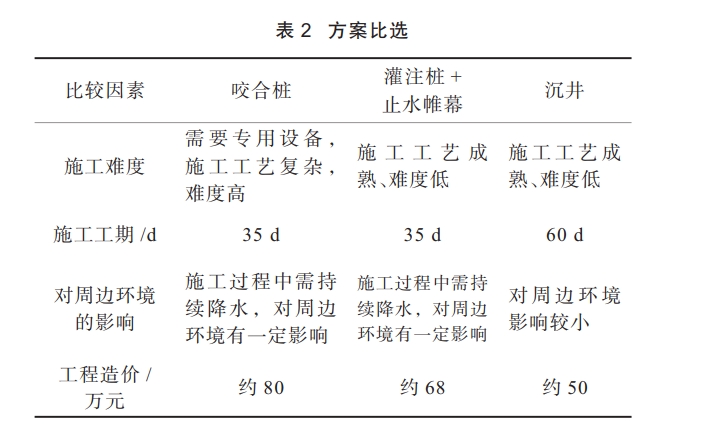 方案比選結果見表 2.經(jīng)過對比分析可知,咬合樁方案造價高、施工難度大,且由于一體化預制泵站基坑工程量較小,設備進場費用較高,占總造價比例較高,因此不推薦此方案。沉井方案造價最低,但工期最長。灌注+止水帷幕方案造價和工期都適中,且本地灌注樁+內支撐支護形式應用較多,考慮到本工程工期較緊,推薦采用灌注樁+止水帷幕方案。