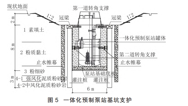 一體化預制泵站基坑深度一般較深,但基坑平面尺寸較小,基坑規(guī)模小,深基坑支護方案應根據(jù)工程實際情況進行方案比選,選型合理、技術可行、經(jīng)濟適用且兼顧工期的要求,選擇最適合的方案。