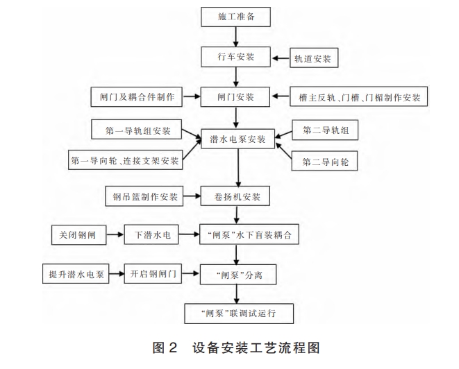 項目完成土建工程施工后,開始泵站金屬結(jié)構(gòu)和機電設(shè)備的安裝工作。設(shè)備安裝工藝流程見圖 2: