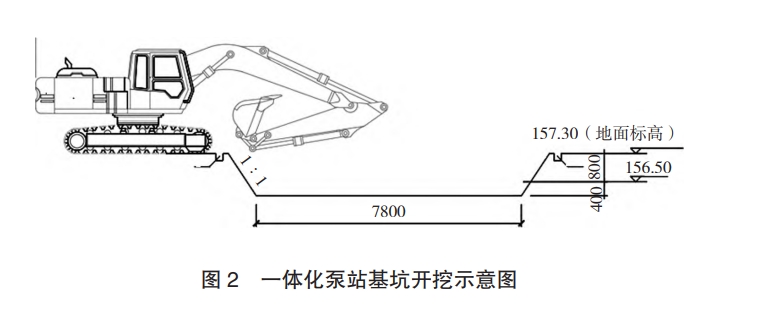 1)基坑工作面準備完成后,進行基坑開挖,第一次開挖深度1.2m(人機配合),采用長挖機挖土下沉,挖土時從中間向四周對稱分層取土,每層取土厚度控制在 50cm 范圍內(nèi)。一體化泵站基坑開挖示意圖見圖 2。