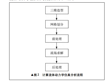 一體化預(yù)制泵站內(nèi)部的流態(tài)優(yōu)劣取決于污水泵進(jìn)水口的入流條件。在污水泵提升污水時(shí),應(yīng)用計(jì)算流體動(dòng)力學(xué)方法分析一體化預(yù)制泵站筒體內(nèi)部的流場(chǎng),以此來觀察泵站的運(yùn)行流態(tài)。筆者采用國(guó)際上運(yùn)用廣泛的 ANSYS 有限元分析軟件,對(duì)一體化預(yù)制泵站進(jìn)行計(jì)算流體動(dòng)力學(xué)仿真分析,過程主要包括三維造型、網(wǎng)格劃分、前處理、流場(chǎng)求解、后處理五個(gè)階段!。計(jì)算流體動(dòng)力學(xué)仿真分析流程如圖2所示。
