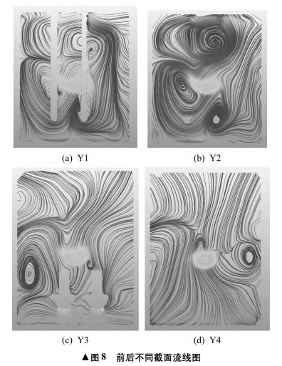 為了更仔細(xì)地觀察筒體底部流場(chǎng),分別在筒體內(nèi)部前后不同位置設(shè)置截面,查看流線和矢量分布。前后不同位置截面如圖7所示,從前往后依次為Y1~Y4截面。前后不同截面流線圖如圖8所示,速度矢量分布如圖9所示。