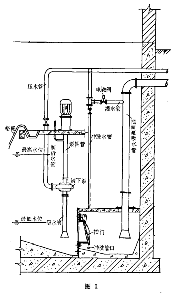 在后一種情況下,當(dāng)開動(dòng)立式液下泵時(shí),同時(shí)開啟灌水管上的電磁閥。于是該泵的出水分為兩路:一路直接排入泵房的出水井。另一路經(jīng)地面泵的吸水管、泵體和壓水管排人泵房的出水井,執(zhí)行灌水排氣程序。當(dāng)灌水時(shí),底閥內(nèi)的拍門必有泄漏,然而該泄漏量只會(huì)占液下泵出水量的很小一部分。因此灌水仍能在很短時(shí)間內(nèi)完成。當(dāng)灌水完成后即可啟動(dòng)地面泵,同時(shí)關(guān)閉灌水管上的電磁閥。此后,底閥內(nèi)的拍門就呈開啟狀態(tài),地面泵與液下泵共同運(yùn)行。