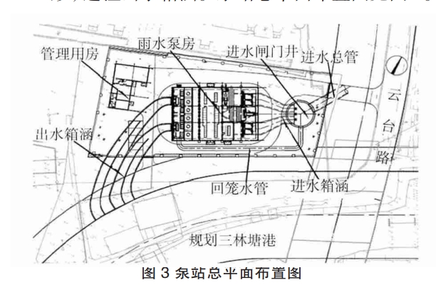 泵站總平面布置一根Ф1600 mm回流水管用于雨水泵站內(nèi)試泵打回籠水。