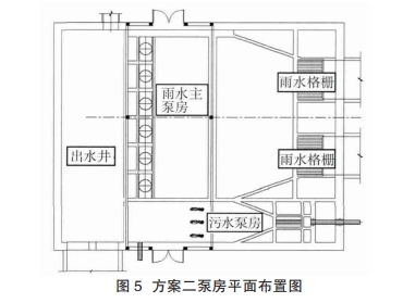 方案二。雨水泵房為雨水直進(jìn)側(cè)出的矩形泵房,在雨水泵房外側(cè)設(shè)置污水截流泵房,側(cè)向出水。主泵房上部設(shè)置設(shè)備間、變配電間及控制室(見圖5)。
