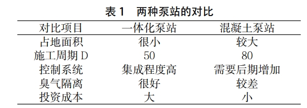 如今,新型的一體化泵站正有取代傳統的混凝土泵站的趨勢。一體化泵站的設備較為集成,雖然投資較高,但是運行自動化程度也高。由于混凝土泵站內部的電氣、控制、工藝等,其投資較為節省,而且操作簡單,很多建設單位考慮了投資的力度和產出之間的關系后,往往愿意建設傳統的泵站工程。兩種泵站各有優勢,也各有缺點,如表1所示進行具體的建設選型時,人們需要結合當地的經濟情況、泵站的選址以及施工周期等要求。