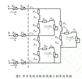 三相異步電機(jī)的核心由三相繞組構(gòu)成,采用異步電機(jī)單相T型等效電路]三角形連接表示的異步電機(jī)三相等效電路如圖2虛線右側(cè)所示。圖2中R、X為電機(jī)定子繞組的等效內(nèi)阻和感抗:R石為電機(jī)轉(zhuǎn)子繞組及負(fù)載換算到定子側(cè)的等效內(nèi)阻和感抗:R、X為電機(jī)等效勵(lì)磁內(nèi)阻和勵(lì)磁感抗;虛線左側(cè)表示配電線路的等效電路。