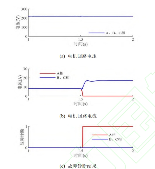 在電機(jī) G 平穩(wěn)運(yùn)行后的 1.5s 時(shí),模擬電機(jī)的A相繞組出現(xiàn)開(kāi)路故障,其波形與診斷結(jié)果如圖5 所示。
