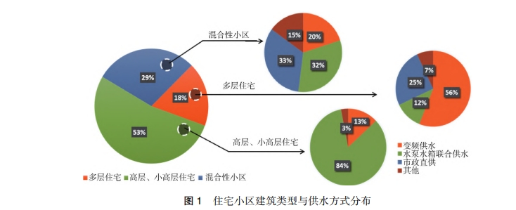 2000 年后建成住宅小區的建筑類型分布與供水方式如圖1所示。數據顯示,2000年后建成住宅小區主要以高層住宅(8層及以上)為主,高層與多層(8層以下)并存的混合住宅小區次之,多層住宅小區最少。供水方式上,多層住宅小區以市政直供和變頻供水為主,占小區總數的 81%,但仍有 12%的小區為水泵水箱聯合供水:高層住宅以水泵水箱聯合供水為主,占小區總數的 84%,約 13%為變頻供水。